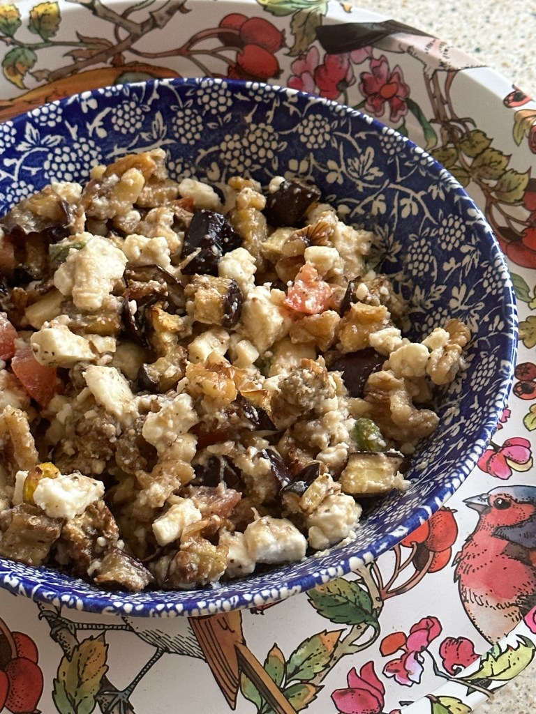 طراوة الباذنجان والجبنة مع قرمشة الفستق والجوز والنكهات الممتزجة مع بعض 💙 ممكن تنأكل مع خبز، أو لوحدها، لذيذة في كِلا الحالتين 💙