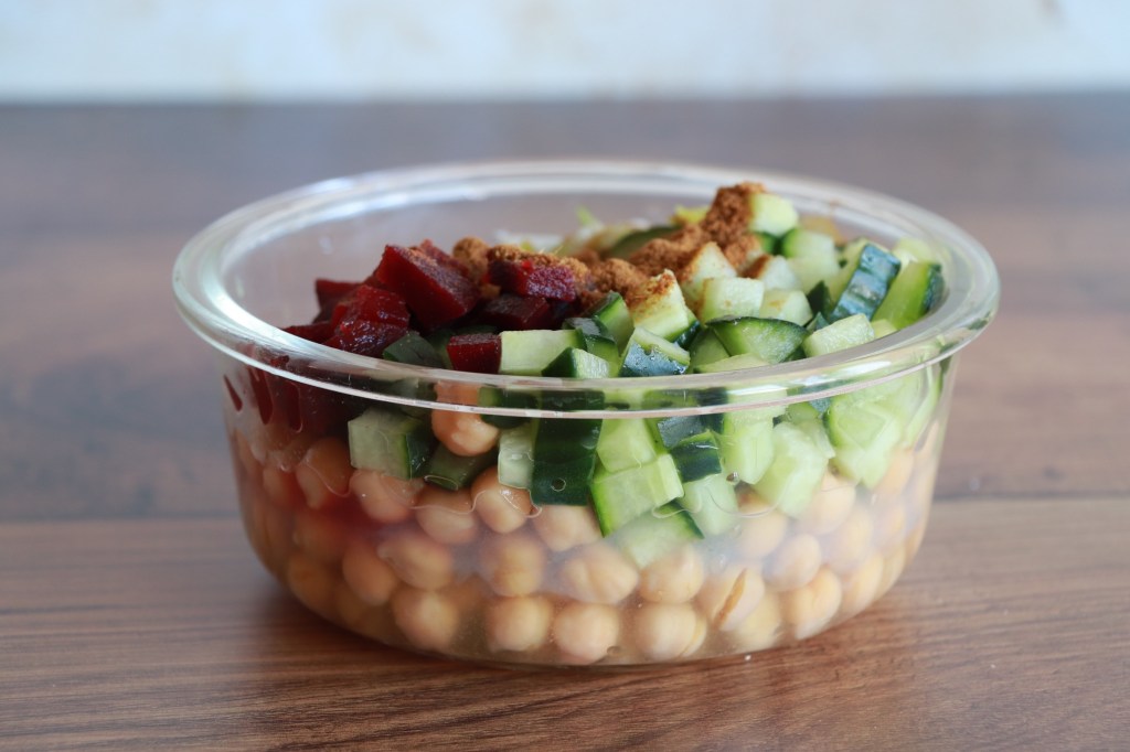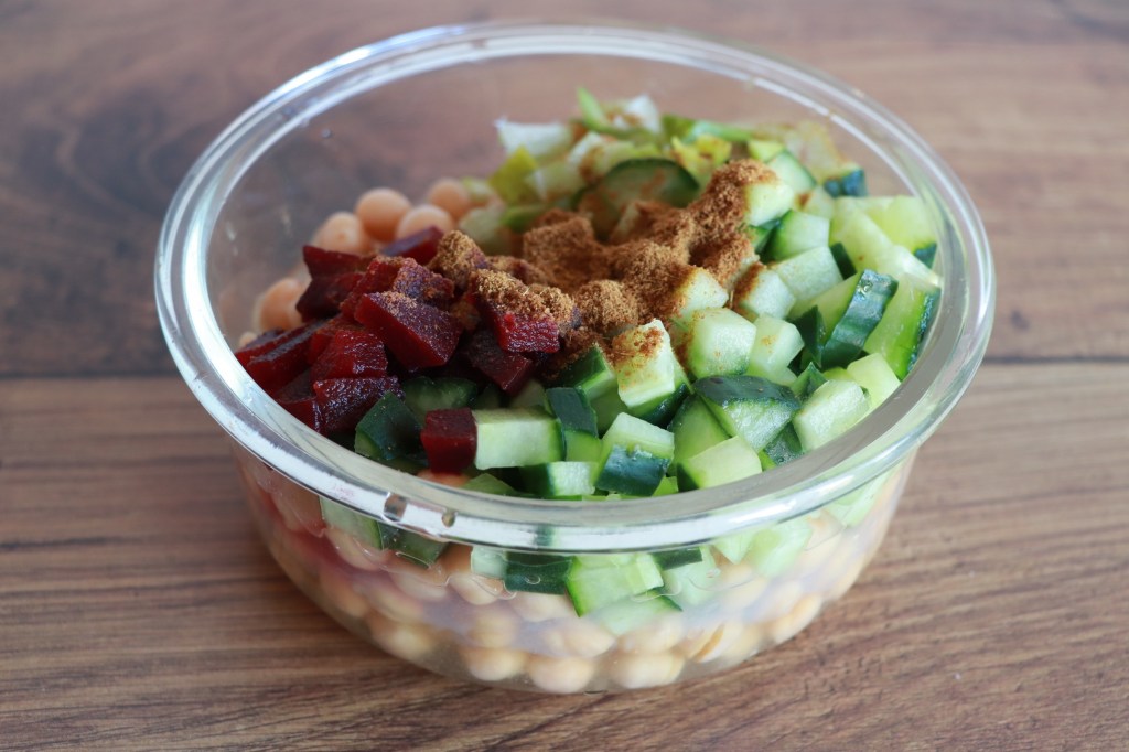 نقطع فوقها بنجر مسلوق ومقشر، خيار، شوية بصل أخضر